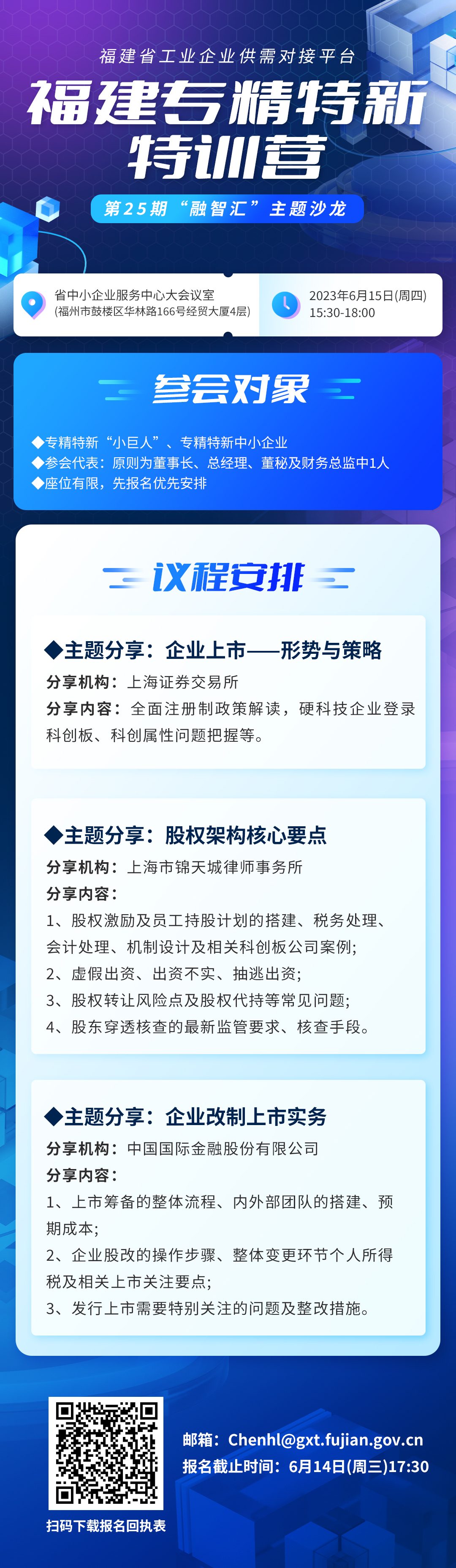 福建省工业企业供需对接平台之第25期“融智汇”主题沙龙暨福建专精特新特训营活动,特邀上交所、知名机构锦天城律所、中金国际专家来分享。欢迎各有需求的企业积极报名!